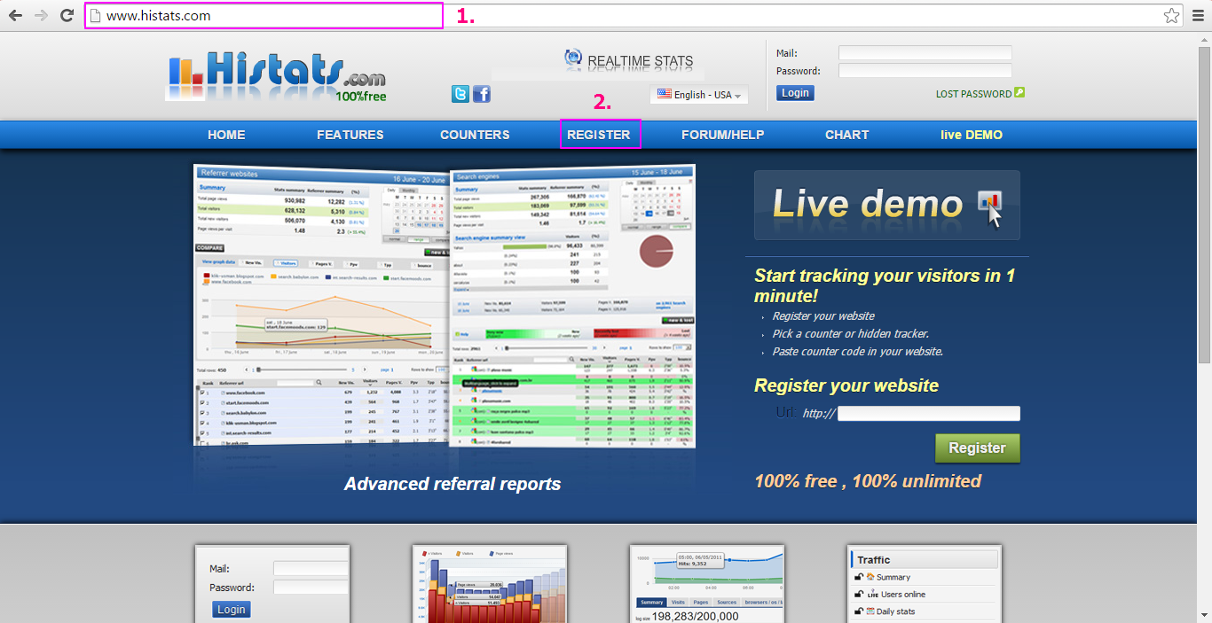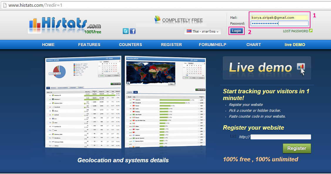 เข้าสู่ระบบในหน้าเว็บไซต์ histats.com ด้วยขั้นตอนดังนี้