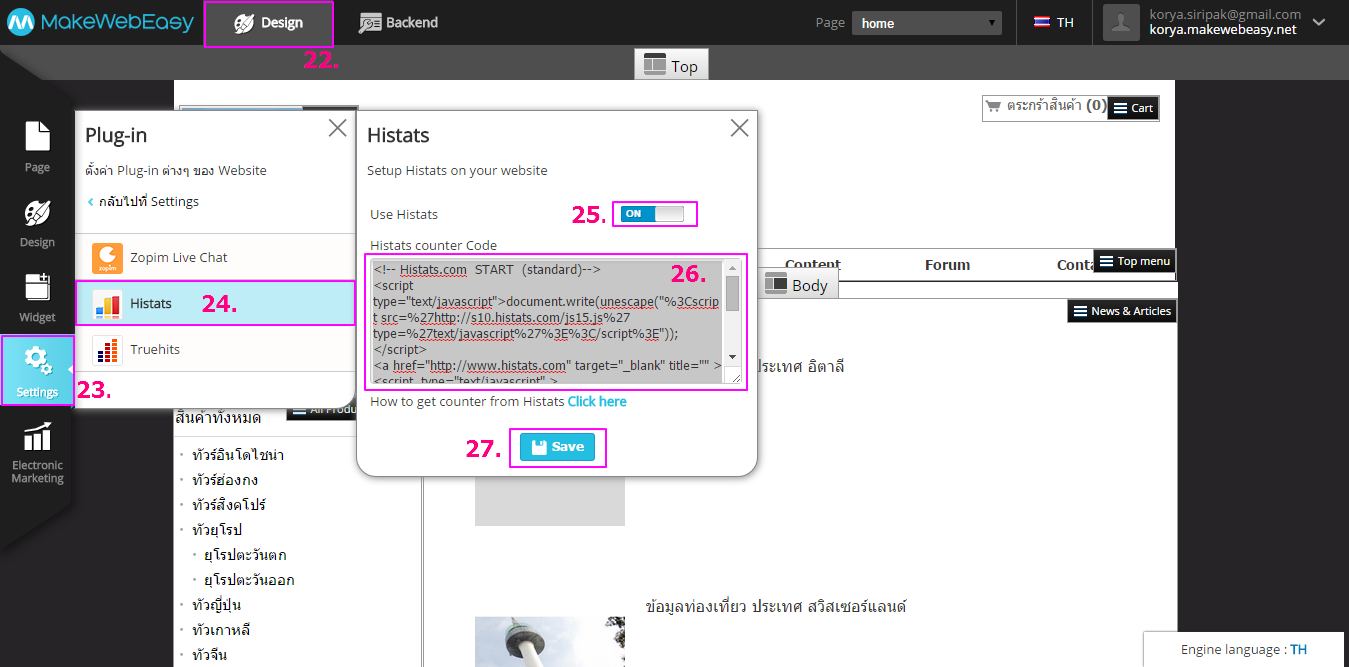 25. คลิก Use Histats ให้เป็น ON เพื่อให้โชว์ในหน้าเว็บไซต์