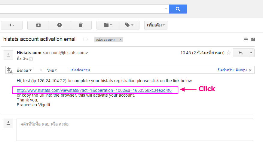 10. คลิกที่ link เพื่อยืนยันตัวตน(verify) ในการสมัครใช้งาน histats
