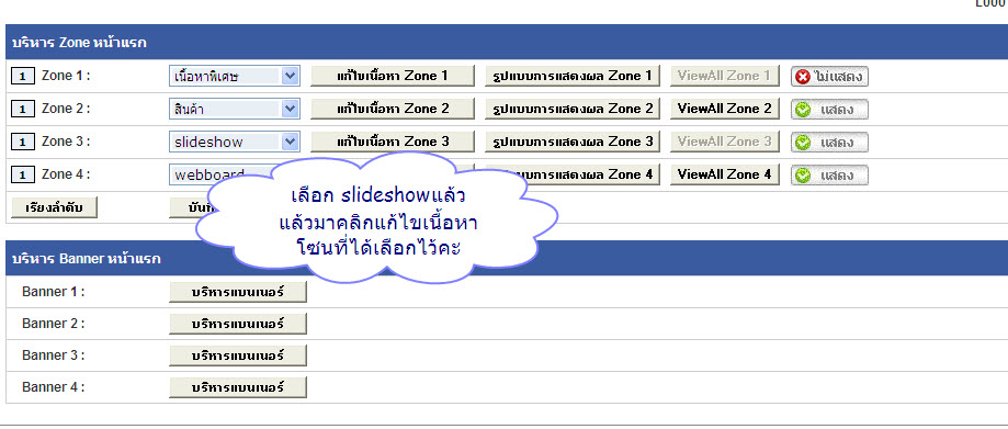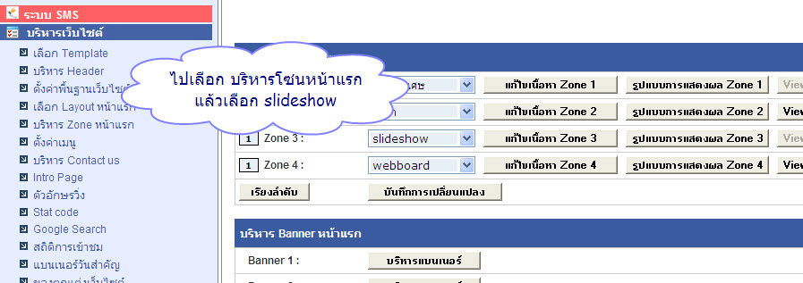 1.ไปเลือกบริหารโซนหน้าแรก แล้วเลิอกโซน ที่ต้องการให้เป็น slideshow